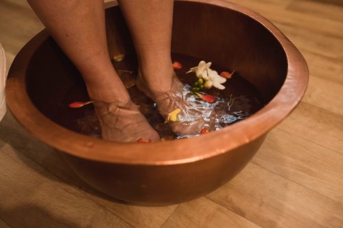 - Mísa Jizerské reflexní úlevy - měděná mísa naplněná teplou vodou, květy, minerálními kameny z Jizerských hor a esenciálním bylinným olejem